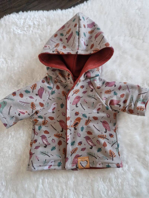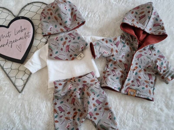 Handgefertigte Puppenkleidung – 5-teiliges Wende-Set mit Vogel- & Blättermotiv in Taupe/Rot-Braun – für Puppen bis 28, 32, 36, 38 & 43 cm