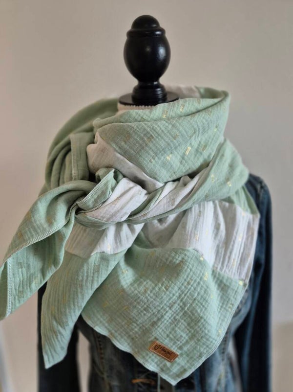 XXL Musselintuch / Schal – Mintgrün & Weiß mit goldenen Akzenten, 135x135 cm