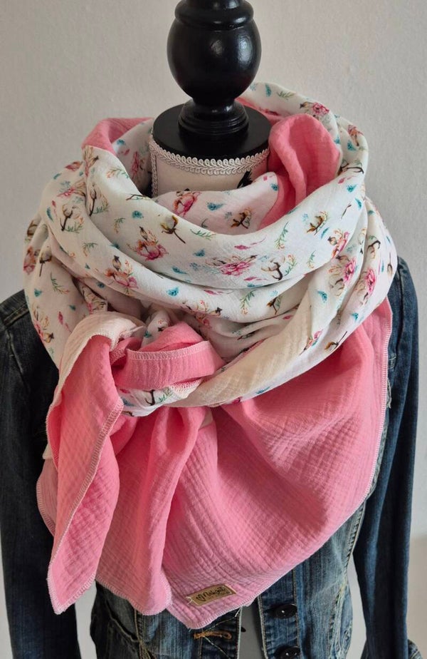 Das sanfte Zusammenspiel der zarten Rosatöne mit einem verspielten Blumenmuster verleiht dem Tuch eine elegante und romantische Ausstrahlung. Hergestellt aus hochwertigem, doppellagigem Musselin (100 % Baumwolle, OEKO-TEX® zertifiziert), bietet es ein besonders weiches, leichtes und atmungsaktives Tragegefühl – ideal auch für empfindliche Haut.