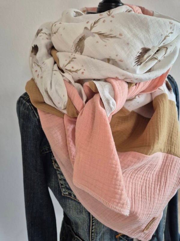 Das zarte Hirsch-Motiv in warmen Sand- und zarten Rosatönen verleiht dem Tuch eine verspielte und zugleich elegante Ausstrahlung. Gefertigt aus hochwertigem, doppellagigem Musselin (100 % Baumwolle, OEKO-TEX® zertifiziert), bietet es ein besonders weiches und atmungsaktives Tragegefühl – ideal auch für empfindliche Haut.