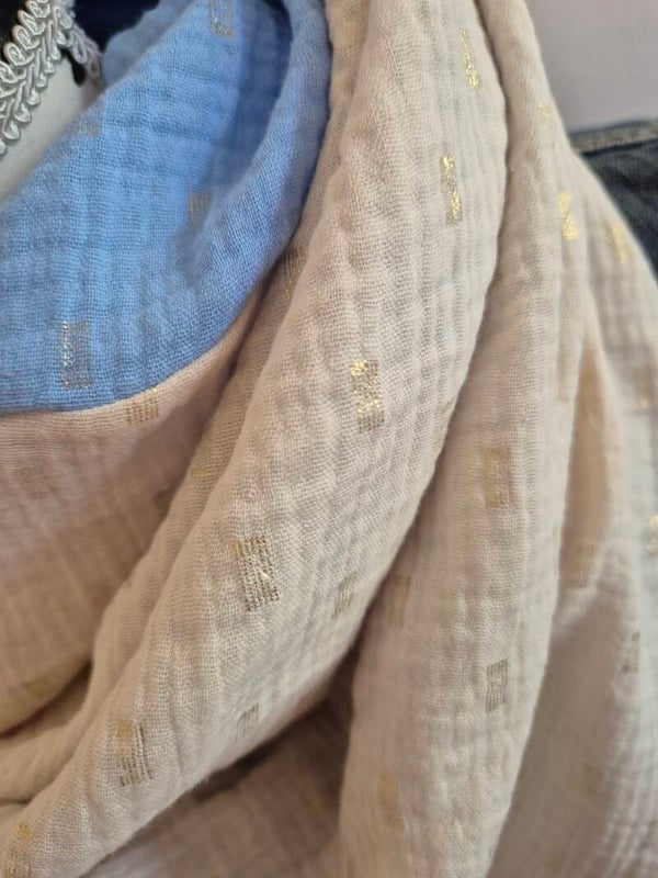 Gefertigt aus hochwertigem, doppellagigem Musselin (100 % Baumwolle, OEKO-TEX® Standard 100), überzeugt das Tuch durch seine weiche Haptik, Atmungsaktivität und Hautfreundlichkeit – ideal auch für empfindliche Haut. Die Kombination aus beruhigendem Hellblau, neutralem Beige und feinen goldenen Highlights sorgt für einen zeitlosen und stilvollen Look.