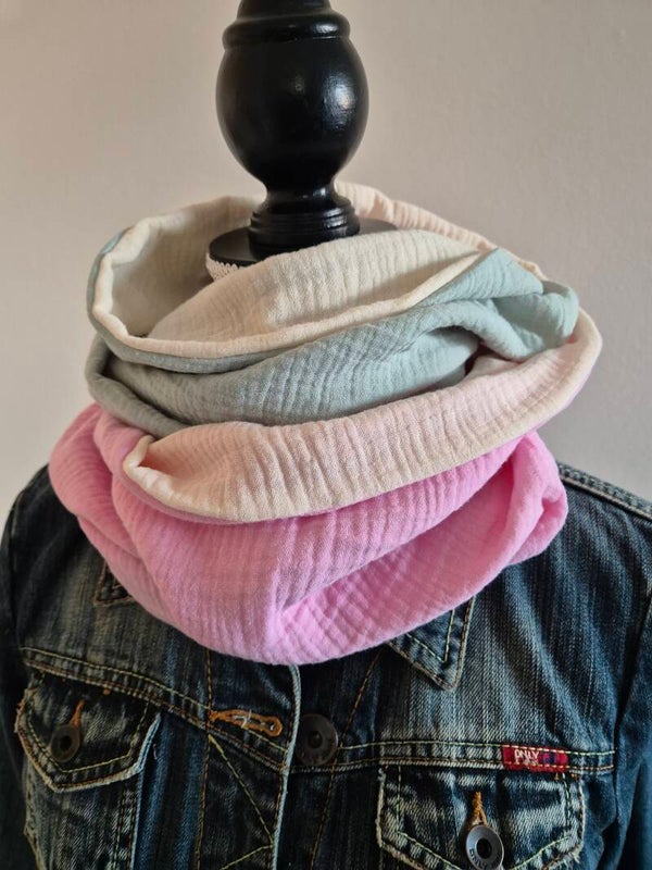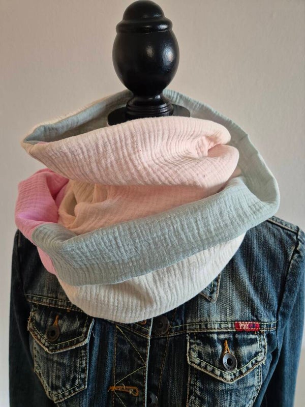 Dieser wunderschöne Loop-Schal aus weichem Musselin ist nicht nur ein modisches Accessoire, sondern auch ein echtes Wohlfühlteil! Die zarten Farben Rosa, Creme und Mintgrün lassen sich vielseitig kombinieren und passen perfekt in jede Jahreszeit – ob Frühling, Sommer, Herbst oder milde Wintertage.