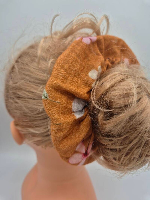 Scrunchie Musselin Hellbraun mit Pastell-Blumen – Haargummi & Geschenk für Damen & Mädchen