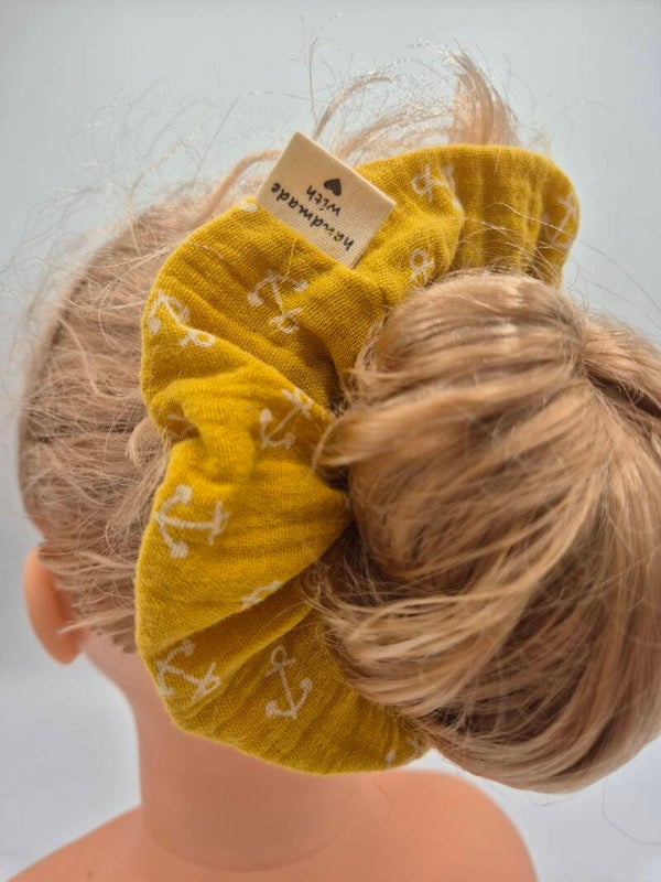 Scrunchie Musselin Senfgelb mit Anker – Haargummi & Geschenk für Damen & Mädchen