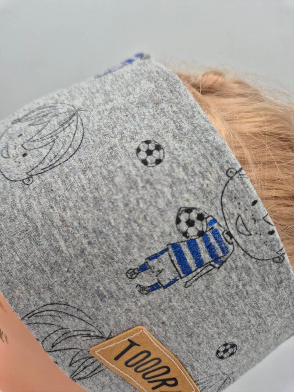 Breites Stirnband Hellgrau mit Fußball – Haarband für Jungen & Mädchen, handgemacht nach Kopfumfang
