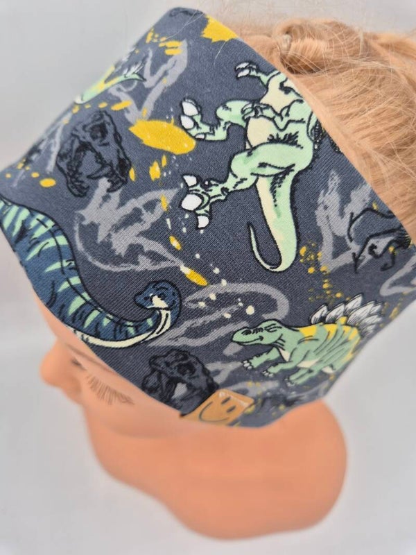 Breites Stirnband Grau mit Dinosaurier – Haarband für Jungen & Mädchen, individuell nach Kopfumfang gefertigt