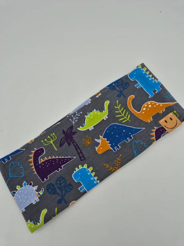 Breites Stirnband Grau mit Dinosaurier – Maßgefertigtes Haarband für Jungen & Mädchen, individuell nach Kopfumfang
