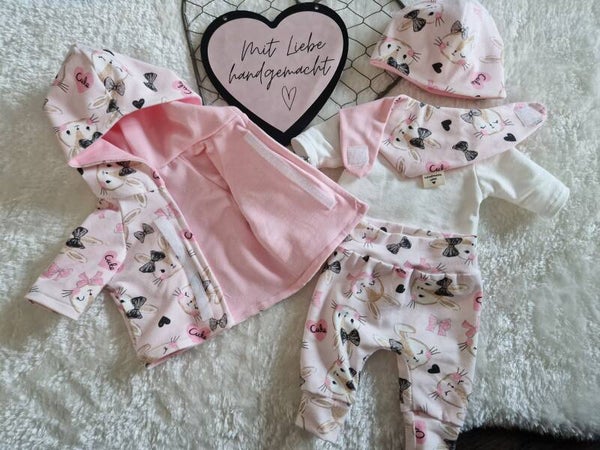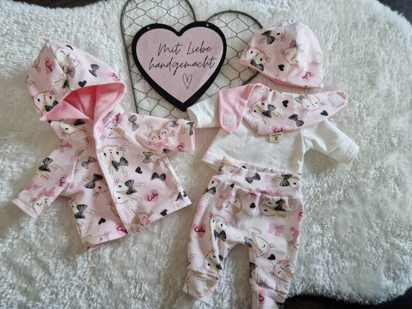 Handgefertigte Puppenkleidung Set – Wende-Jacke, Hose, Shirt, Mütze & Halstuch, Hase Motiv, Rosa, Größen 28–45 cm