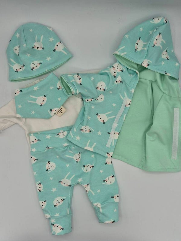 Motiv: Hellblauer Hauptstoff mit Hase und Sternen, Kombi-Stoff mintgrün