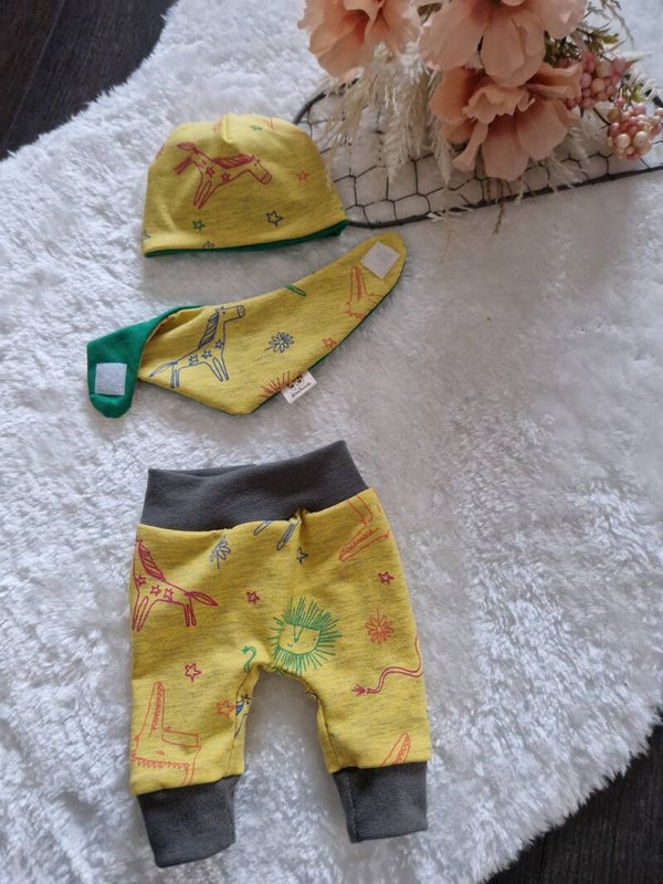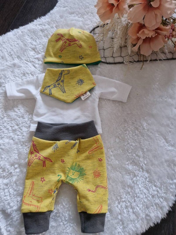 Dieses liebevoll handgefertigte Puppenkleidung-Set bringt fröhliche Farben und tierische Motive ins Puppenleben. Mütze und Halstuch sind zum Wenden – so hat deine Puppe 2 verschiedene Looks in einem Set.