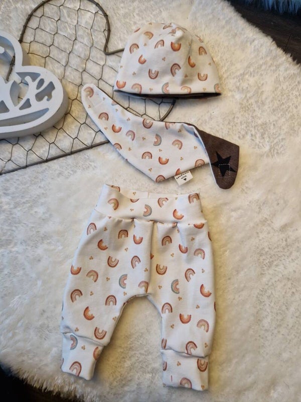 Stoffe: Hauptstoff creme-weiß mit Regenbogen-Motiv, Kombistoff Braun mit Sternenpunkten