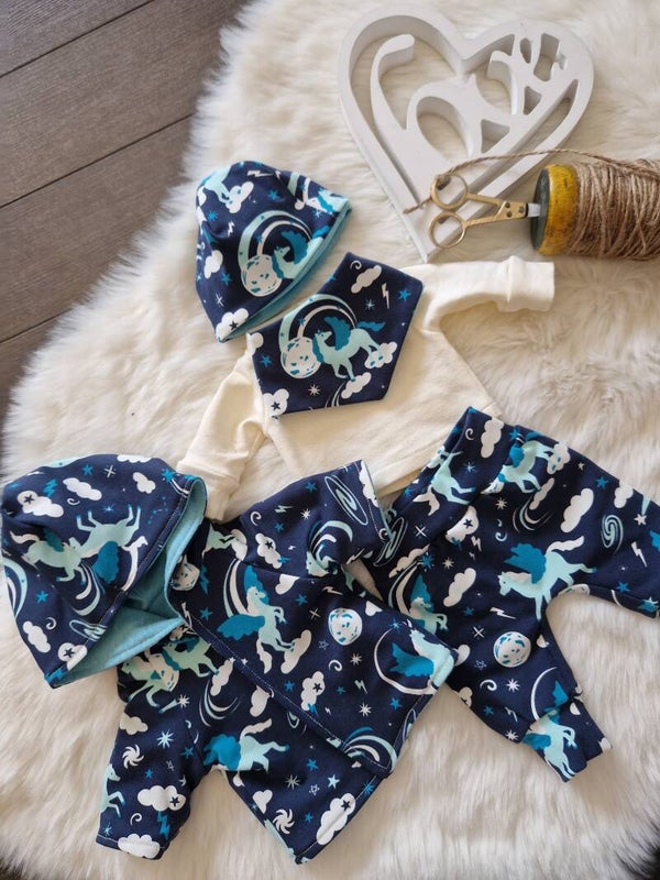 Handgefertigte Puppenkleidung 28–45 cm, Einhorn & Mond, Wende-Jacke, Hose, Shirt, Mütze & Halstuch, Geschenk Geburtstag Weihnachten