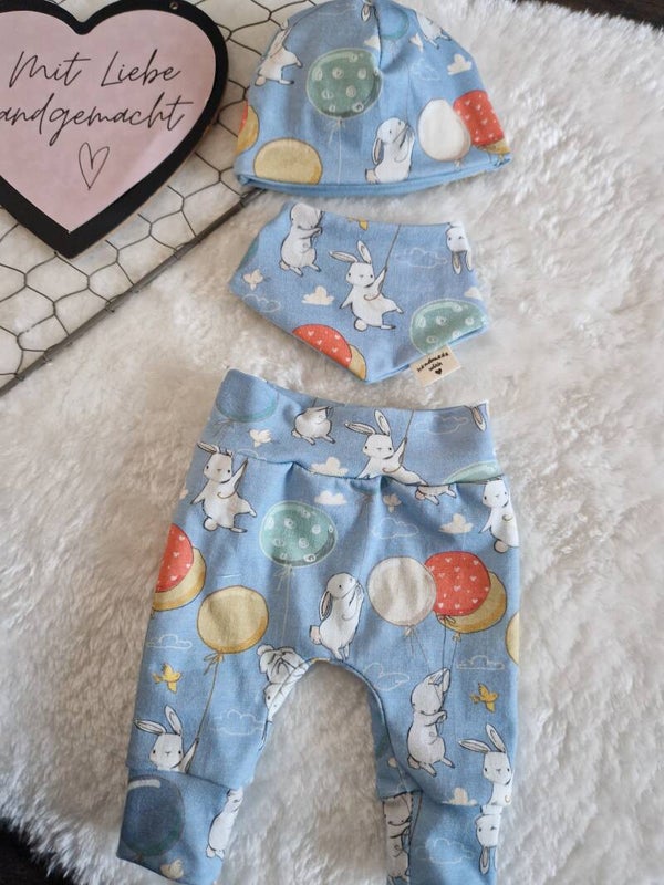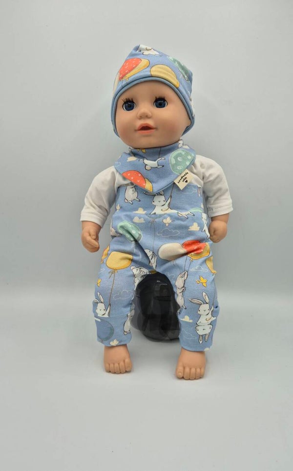 Handgefertigtes Puppenset 36–38 cm – Hellblau mit Hase & Luftballon – 4-teilig, Wende-Mütze & Halstuch