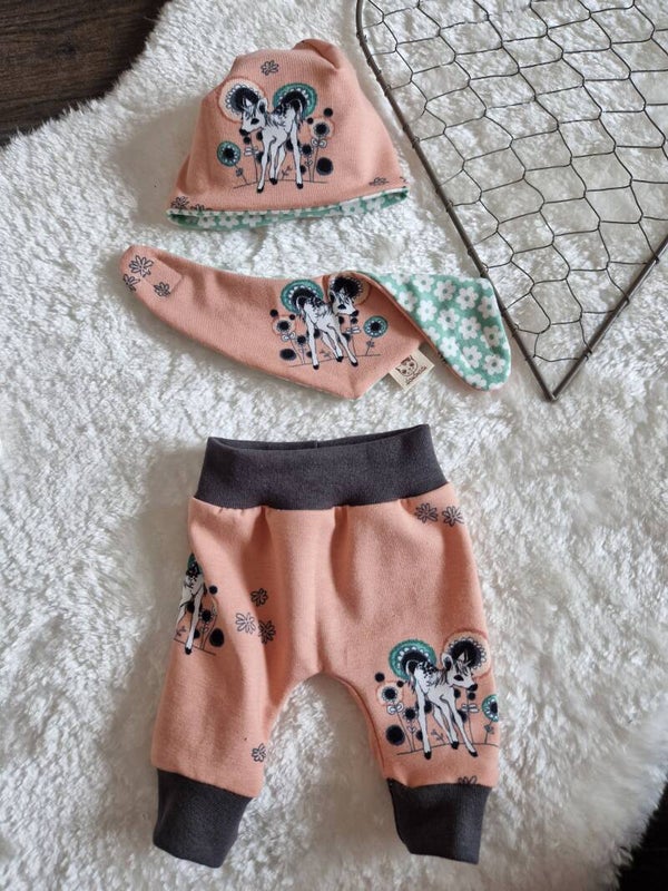 Handgefertigtes Puppenset 36–38 cm, rosa Reh & Luftballon, 4-teilig, Wende-Mütze & Halstuch, Puppenkleidung, Geschenk Geburtstag Weihnachten
